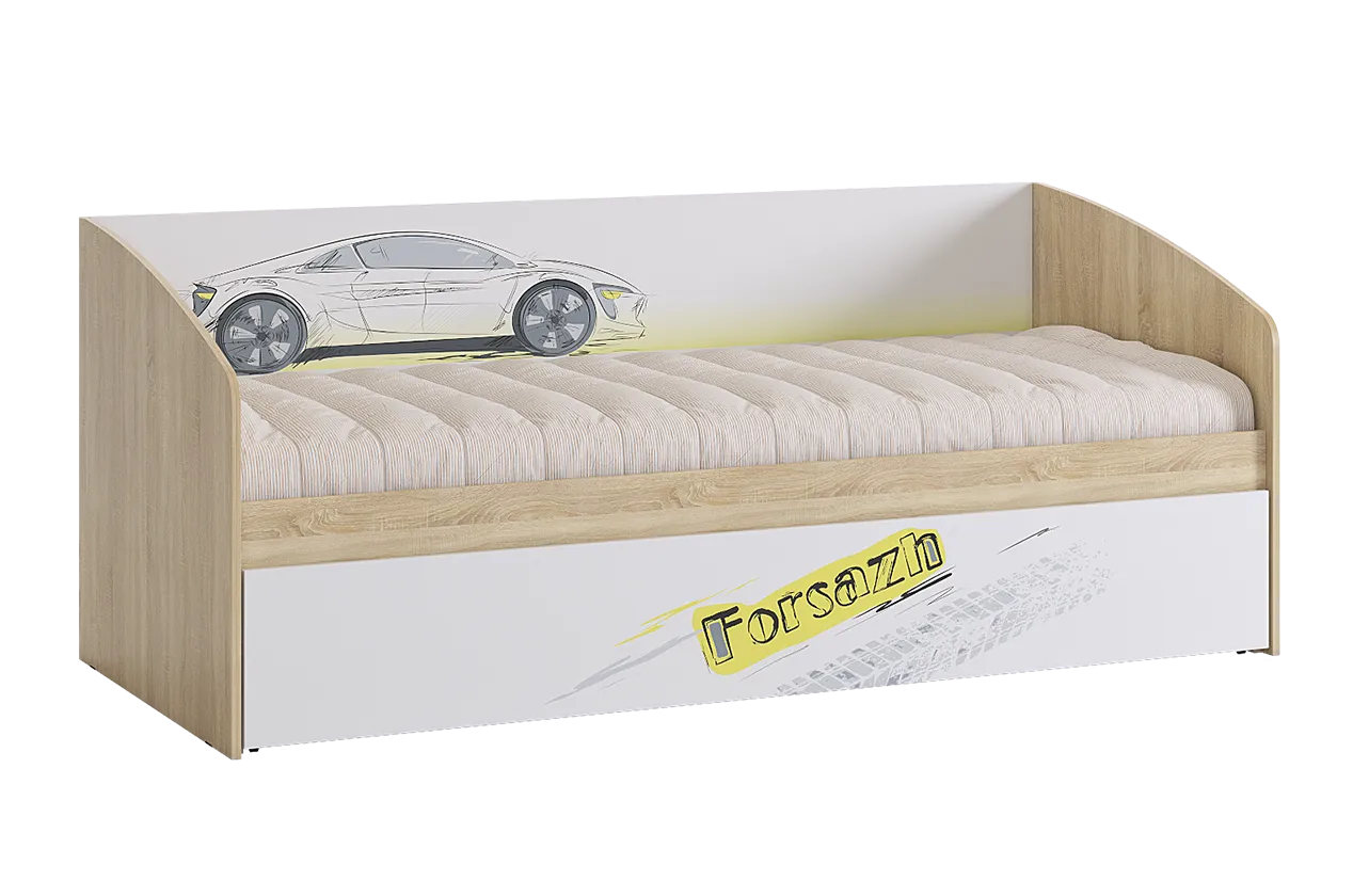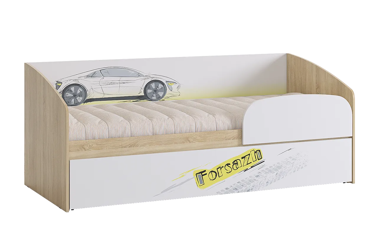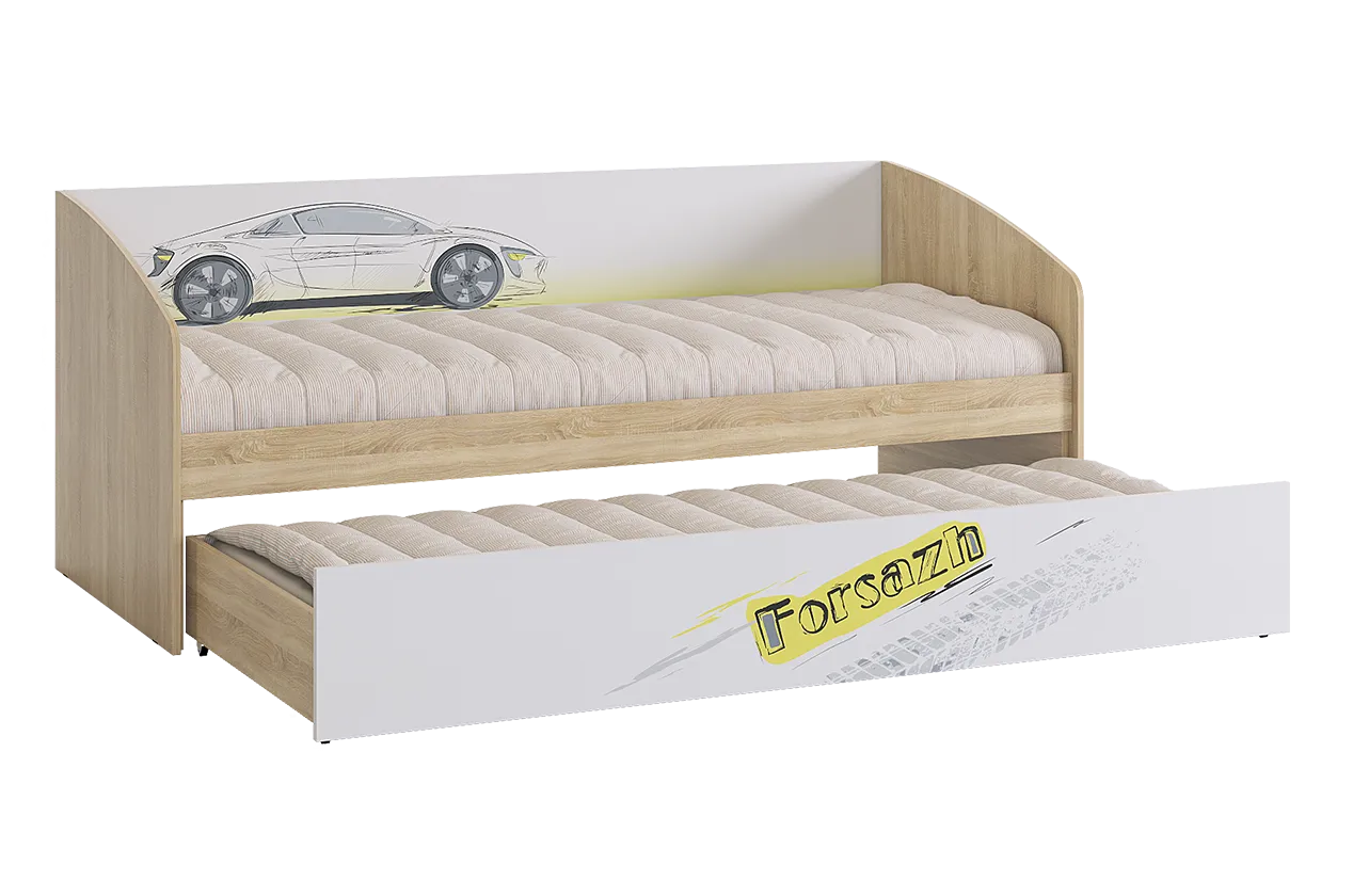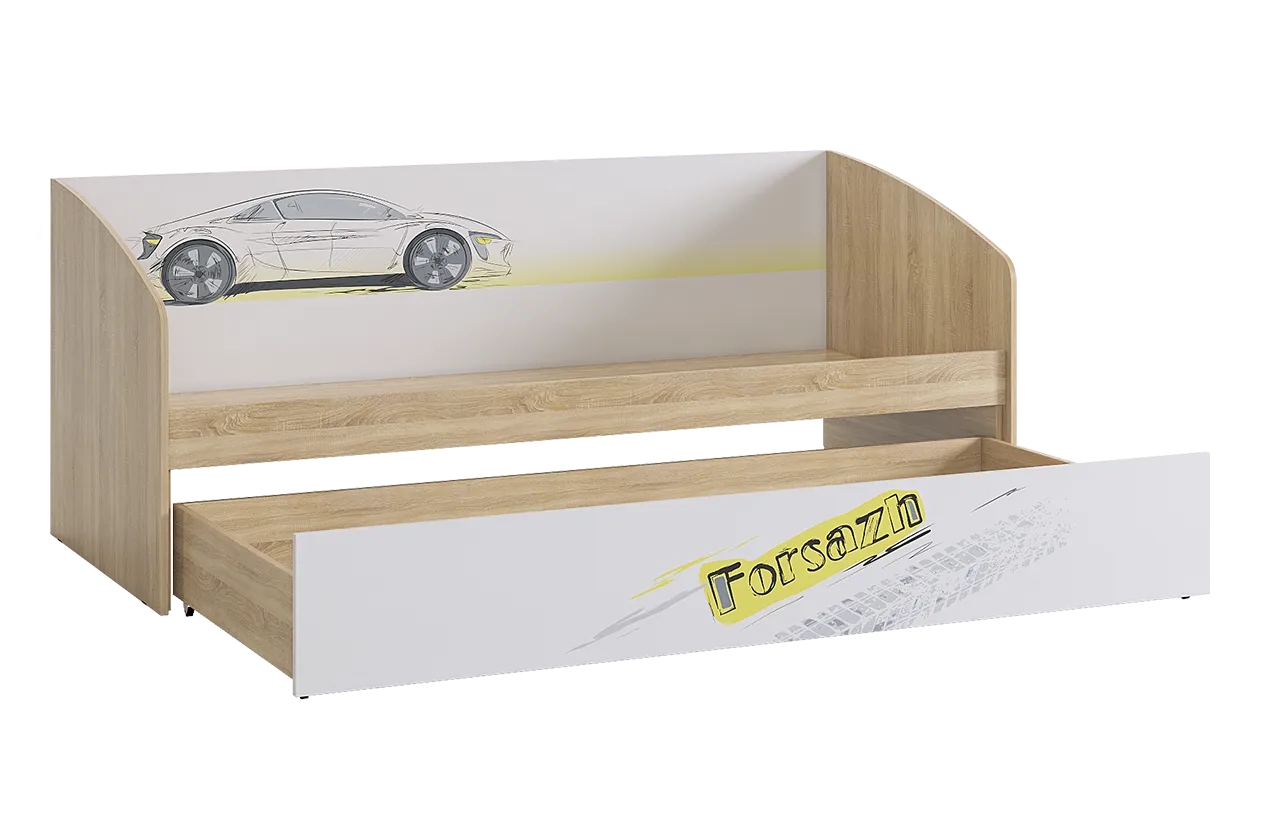 Дополнительное удобное спальное место или большой выдвижной ящик для хранения постельного белья и игрушек, на выбор, решать вам. Стильный принтерный рисунок на фасаде. Детская «Форсаж» - это стильная, современная детская, которая понравится каждому ребенку. Рисунок устойчив к истиранию и ультрафиолету.