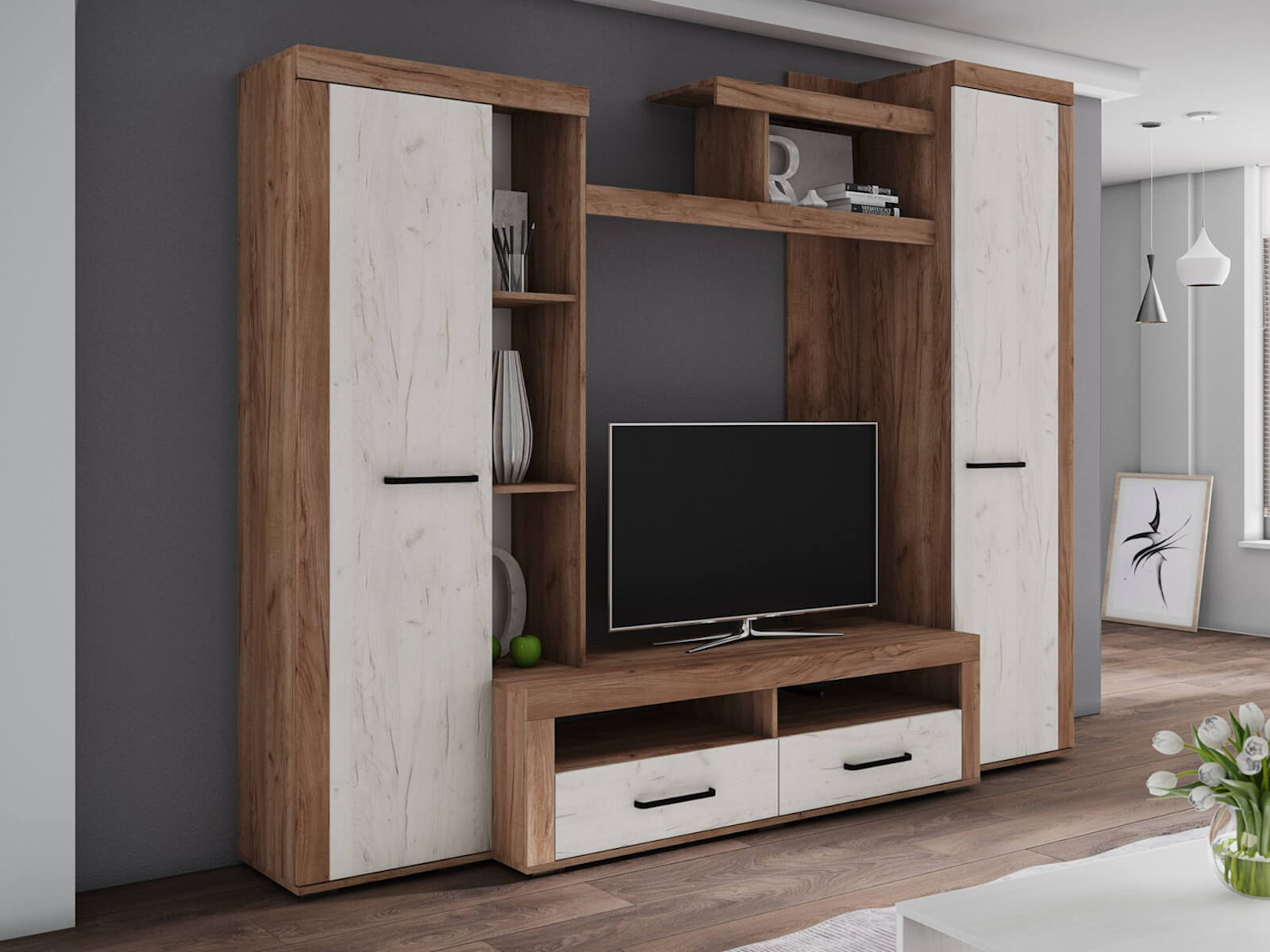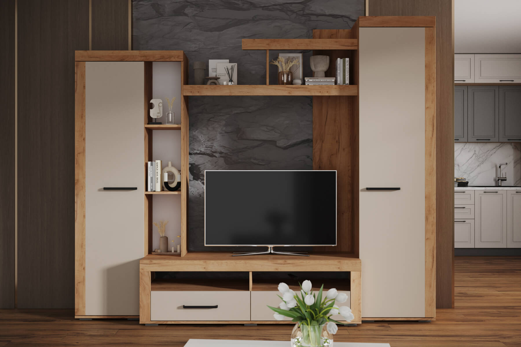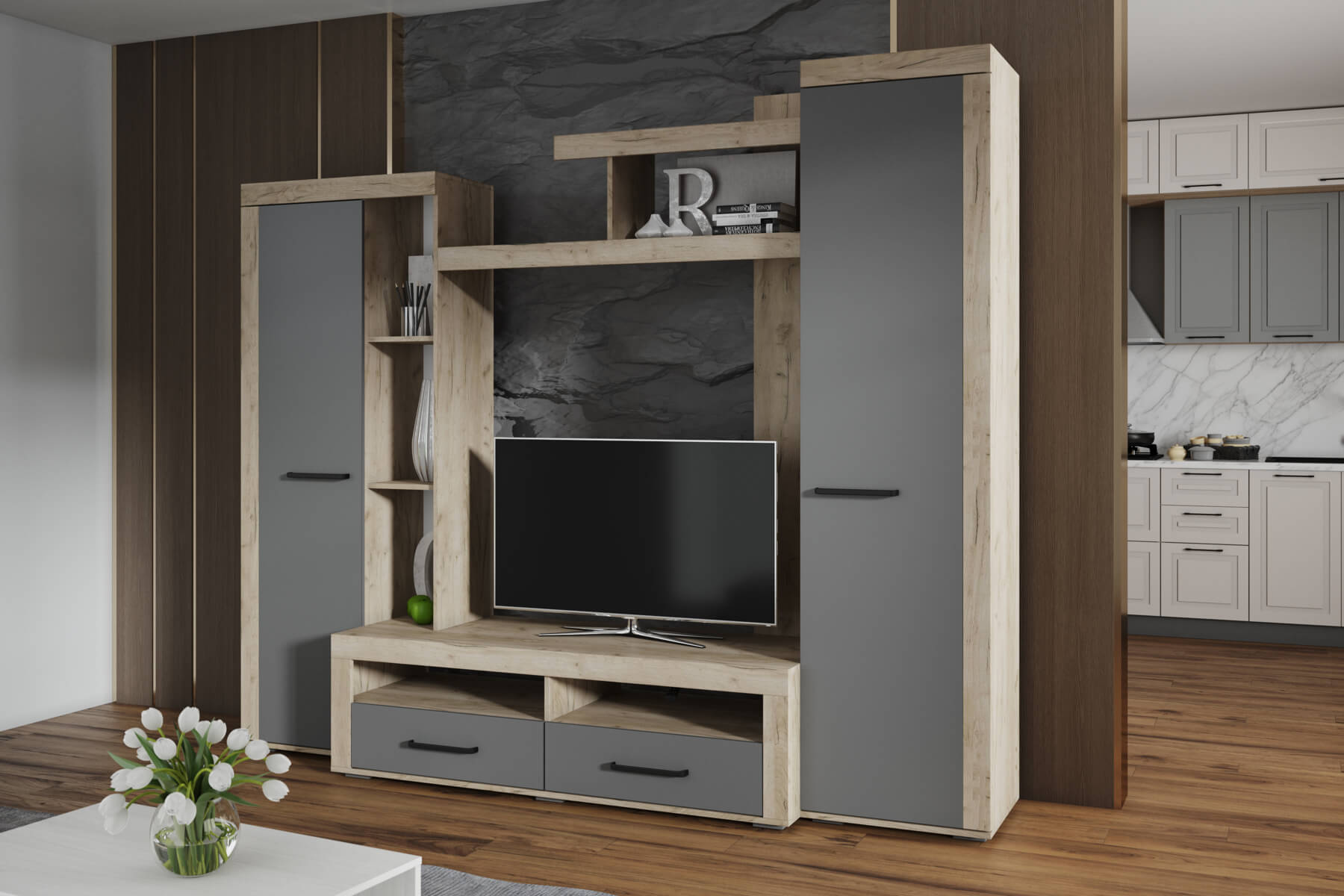 Гостиная Марсель-4 дуб крафт золотой/кашемир, крафт табачный/дуб крафт белый, крафт серый/графит серый