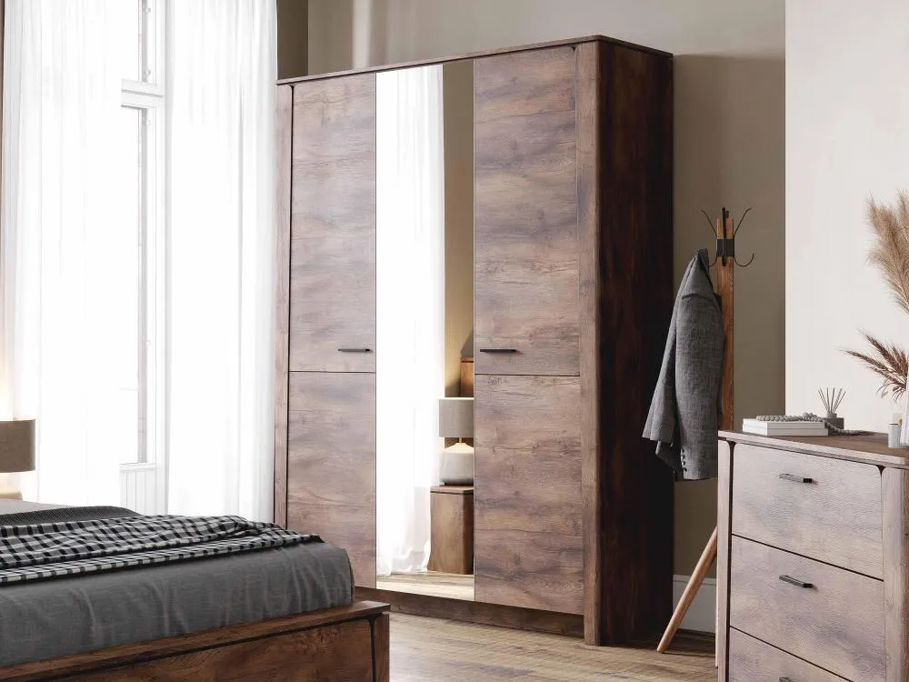 В состав гарнитура входят различные элементы, которые позволят вам создать уютную спальню, такие как: шкаф двухдверный, шкаф трёхдверный, туалетный столик, комод с тремя ящиками, тумба с ящиком, кровать.