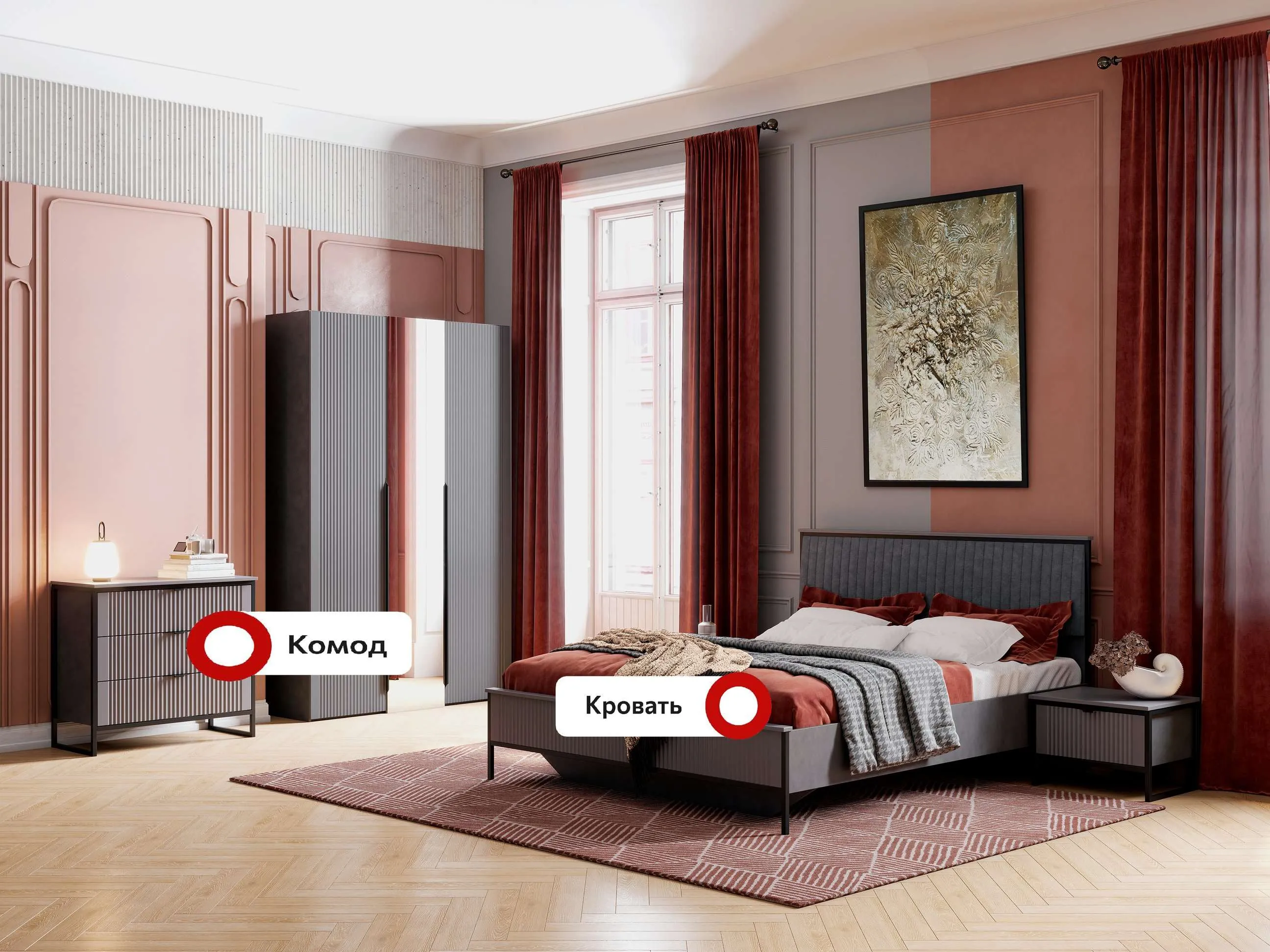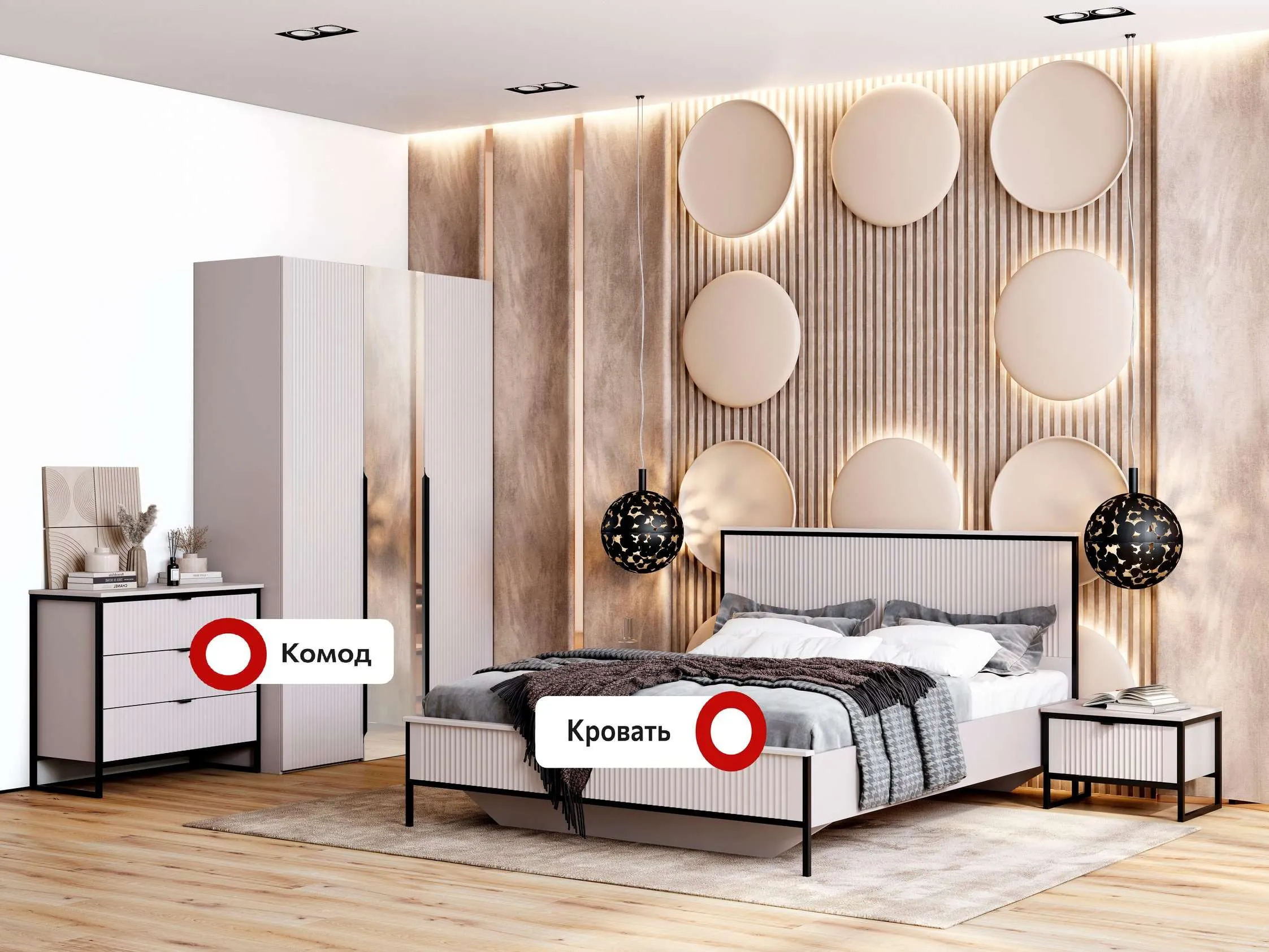 Гарнитур подходит как для просторных, так и для небольших спален, помогая эффективно использовать пространство и создавать уютное место для отдыха и сна.